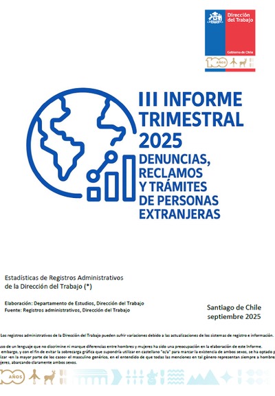 Este informe contiene datos de registros administrativos correspondientes a fiscalización, conciliación y solicitudes de actuaciones por ministros de fe presentados por personas trabajadoras extranjeras ante la Dirección del Trabajo acumuladas al tercer trimestre del año 2025. Además, el anexo 3er Informe trimestral 2025, contiene datos desagregados por región y oficinas de la Inspección del Trabajo respecto a registros administrativos de denuncias, reclamos y otros trámites realizados por trabajadores/as extranjeros/as en el período enero-septiembre.