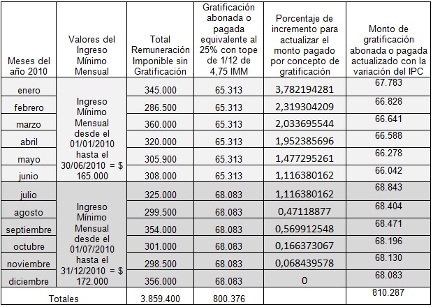 De la tabla inserta, se aprecia que al monto de la gratificación abonada o pagada mensualmente se le aplicó en cada mes el porcentaje de incremento correspondiente al IPC, obteniendo así la cantidad mensual actualizada, cuyo total asciende a $810.287, la que se resta a la suma de $817.000 equivalente a los 4,75 IMM calculados sobre la base de $172.000 IMM del mes de Diciembre de 2010, - utilizado en el ejemplo -, dando como resultado la suma de $6.713 que corresponde a la diferencia de gratificación que debe ser pagada al trabajador.