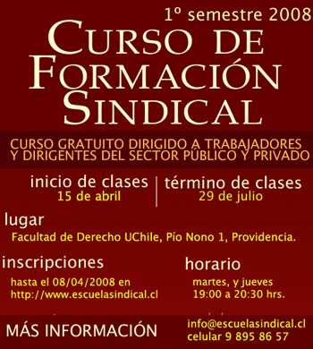 La División de Relaciones Laborales de la Dirección del Trabajo informa que ya están abiertas las inscripciones para el Curso de Formación Sindical, correspondiente al 1er Semestre 2008.