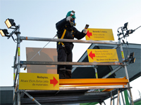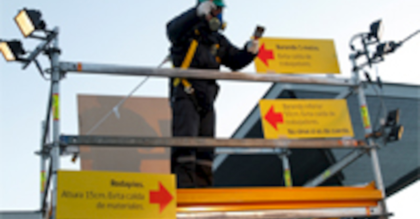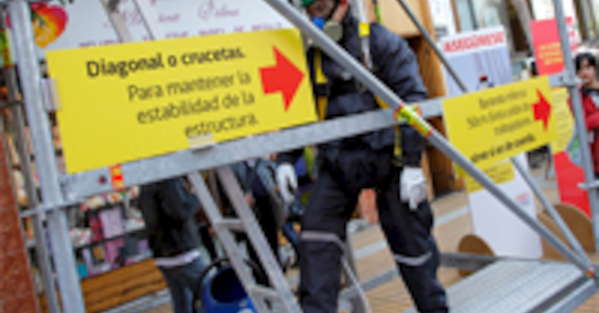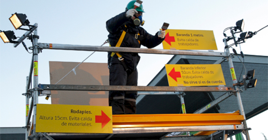 La actividad consiste en una instalación que recrea baños, comedores y andamios, con todos los elementos higiénicos y de seguridad que deben ser cumplidos. Arriba del andamio, un actor vestido de obrero ejecuta acciones correctas e imprudentes.