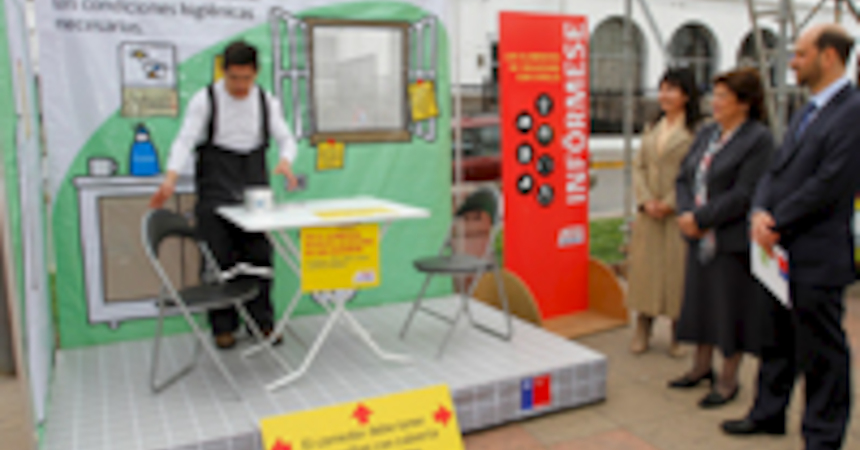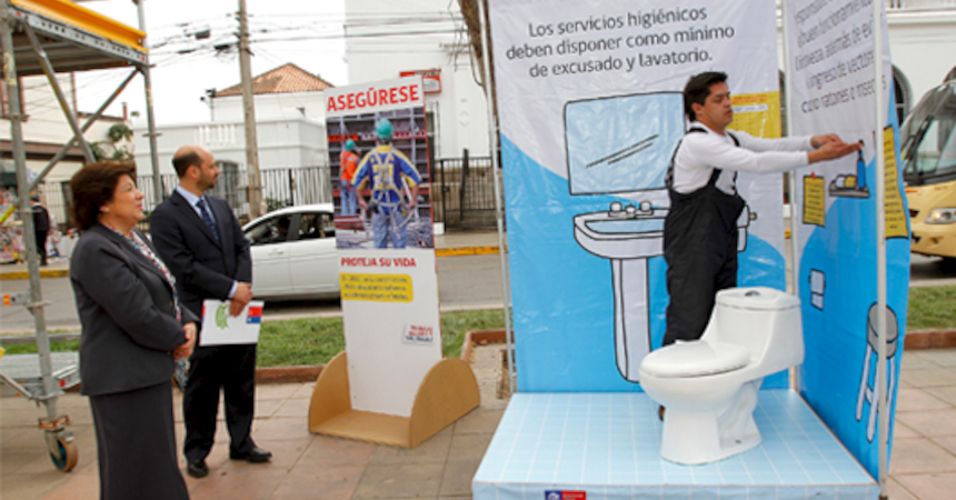 Un comedor, un baño y un andamio son parte de la instalación interactiva de higiene y seguridad ideada por la Dirección del Trabajo (DT) y que recorre el país para difundir entre trabajadores, empleadores, estudiantes y público en general las medidas de seguridad con las que deben contar en los lugares de trabajo.