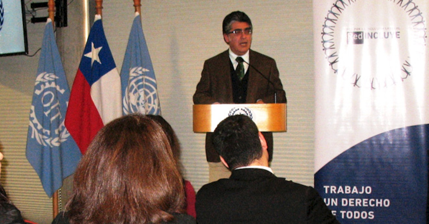 En representación de la ministra del Trabajo, Javiera Blanco, el subdirector del Trabajo, Rafael Pereira, dirigió algunas palabras a los participantes de la Asamblea General de la Red Incluye, que llegaron hasta el salón de actos de la OIT para escuchar la cuenta pública del directorio, con respecto a su gestión del año pasado, y la planificación para el periodo en curso.