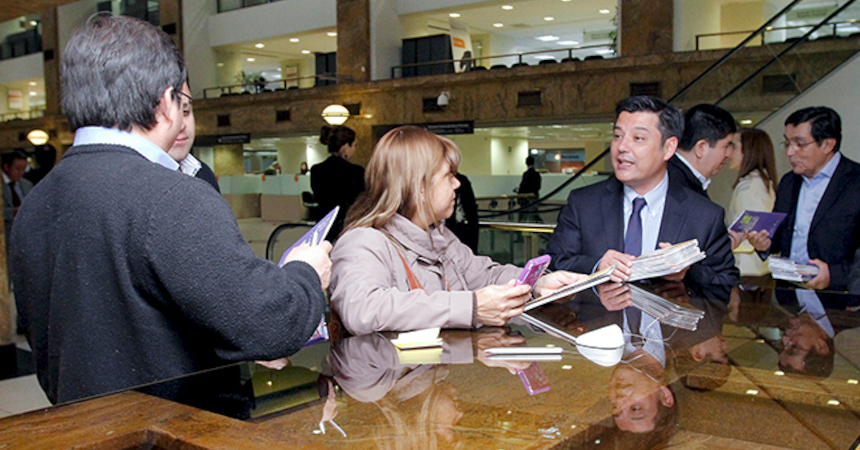 Con la entrega de libros y volantes a usuarios de BancoEstado se realizó el lanzamiento de la décimo cuarta versión del concurso de cuentos "Mi vida y mi Trabajo," organizado por la Dirección del Trabajo.