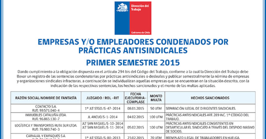 El número de condenas judiciales por prácticas antisindicales durante el primer semestre de 2015 es similar al del segundo semestre de 2014, según lo registra la nómina divulgada hoy por la Dirección del Trabajo en un diario de circulación nacional, cumpliendo así con su deber permanente de proteger la actividad sindical de acciones que persigan desalentarla, como lo afirmó su máxima autoridad, Christian Melis.