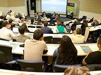 La exposición, intercambio de opiniones y respuestas a consultas fueron moderadas por el académico de la facultad Sergio Gamonal y se prolongaron durante poco más de dos horas ante un nutrido público formado por estudiantes, dirigentes sindicales, jueces del trabajo y académicos.