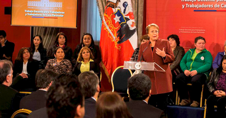 En un salón Montt Varas del Palacio de La Moneda atiborrado de trabajadoras de casa particular, la Presidenta Michelle Bachelet suscribió este viernes la promulgación del Convenio 189 de la Organización Internacional del Trabajo (OIT) sobre el trabajo decente para este sector que en los últimos meses ha visto mejorada legalmente su situación en el mundo laboral chileno.