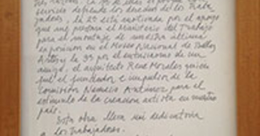 Una de esas obras la donó en el año 1999 a la Dirección del Trabajo y desde entonces engalana la principal sala de reuniones del edificio central de la institución, tal como lo muestra nuestra foto de portada.