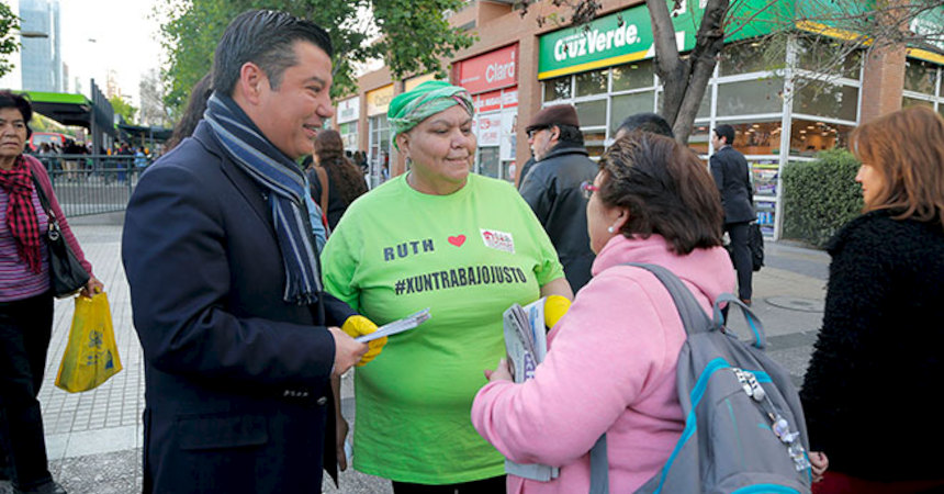 El Director del Trabajo llegó hasta el metro escuela Militar para participar del lanzamiento de la campaña "Trabajadoras de casa particular: X un trabajo justo", organizada por la Federación de Sindicatos de Trabajadoras de Casa Particular - Fesintracap- y la Fundación Prodemu.