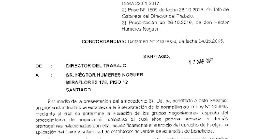 Hasta ahora, la DT había emitido nueve dictámenes de oficio sobre variados aspectos del nuevo texto legal. El de ahora responde a una consulta específica del abogado y profesor Héctor Humeres. Para emitir su pronunciamiento de respuesta, la DT solicitó un informe en derecho al doctor en derecho y experto en derecho administrativo, profesor Luis Cordero.