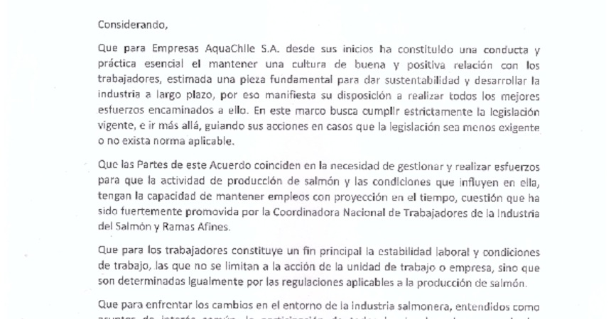 Como prueba de la buena voluntad hoy imperante, los dirigentes sindicales de Agua Chile le entregaron al director del Trabajo copia del reciente acuerdo suscrito con la empresa que determinó que desde el 24 de julio pasado se puso fin a los contratos por obra y faena, a la vez que no se llevará a tribunales el caso de un desafuero ilegal de una trabajadora embarazada.