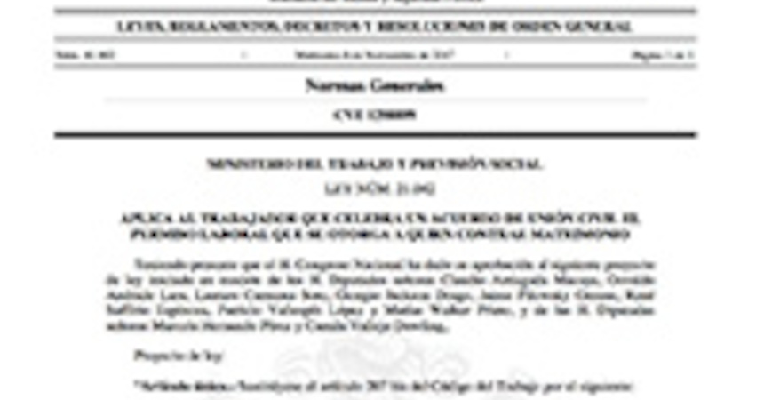 Este último establece: “Sustitúyese el artículo 207 bis del Código del Trabajo por el siguiente: “Artículo 207 bis.- En el caso de contraer matrimonio o celebrar un acuerdo de unión civil, de conformidad con lo previsto en la ley Nº 20.830, todo trabajador tendrá derecho a cinco días hábiles continuos de permiso pagado, adicional al feriado anual, independientemente del tiempo de servicio.