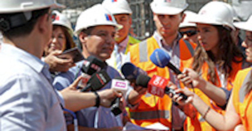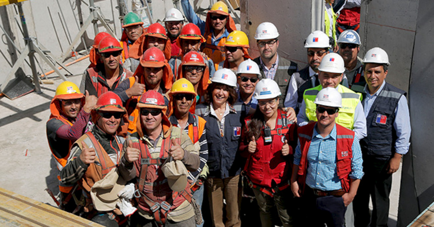 Ambas autoridades subieron hasta el cuarto piso de la obra, el más avanzado hasta ahora, para conversar con ejecutivos de la empresa y trabajadores, todos los cuales usaban adecuadamente todos los elementos de protección personal contra la radiación solar: cascos, gorros legionarios para resguardar nuca y orejas, lentes con filtros UV y pantalones y camisas o poleras de manga larga.