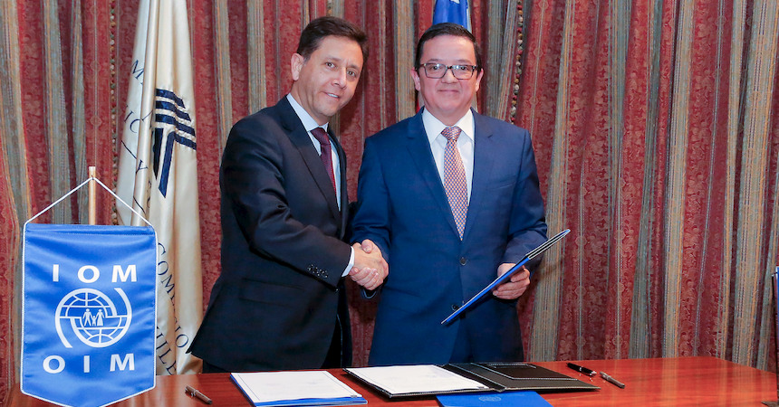 El director del Trabajo, Mauricio Peñaloza y el Jefe de Misión de la Organización Internacional para Migrantes (OIM Chile) Norberto Girón, firmaron este martes un acuerdo de cooperación entre ambas instituciones.