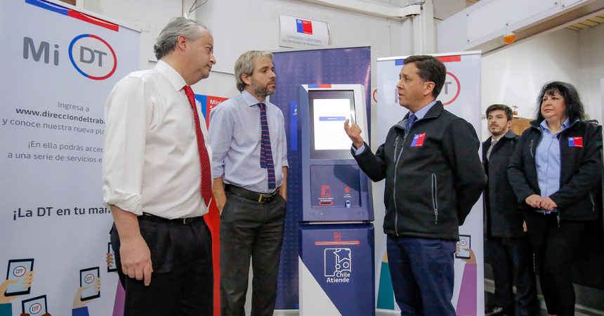 El Ministro Secretario General de la Presidencia, Gonzalo Blumel; junto al Ministro del Trabajo y Previsión Social, Nicolás Monckeberg; y el Director Nacional del Trabajo, Mauricio Peñaloza; presentó la nueva plataforma Mi DT y los nuevos módulos de auto atención ChileAtiende que estarán ubicados a lo largo del país, esto en un recorrido por la Inspección Provincial del Trabajo Santiago.