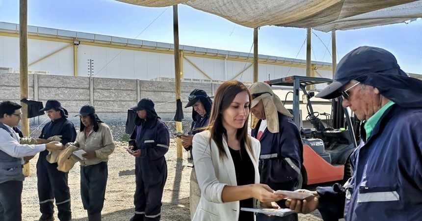 Allí un equipo de esa dirección regional, encabezado por su directora Esperanza Echeverría, se reunió con trabajadores agrícolas de la zona. Por las características de su labor y la época del año en que la realizan, estos trabajadores están en riesgo de contraer enfermedades a la piel si ellos y sus empleadores no tomar resguardos adecuados.