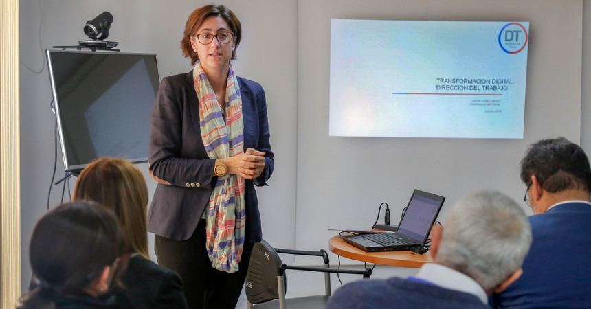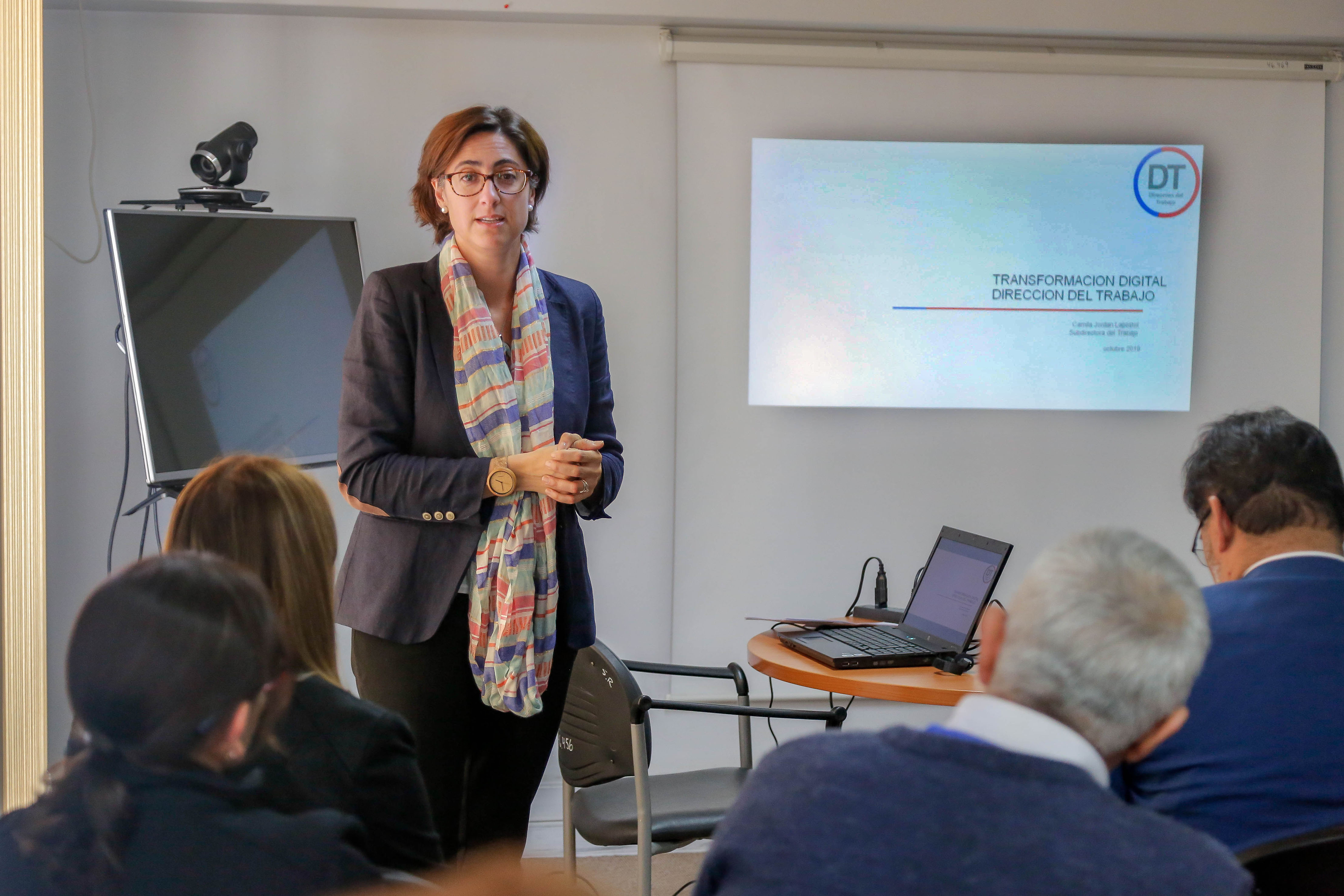 La exposición "Modernización de los sistemas de información de la Dirección del Trabajo" estuvo a cargo de la subdirectora del Trabajo, Camila Jordán, quien fue acompañada por el director regional metropolitano poniente del Trabajo, Jorge Meléndez.