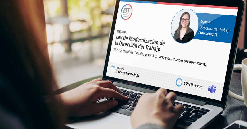 La DT invita a sus usuarios/as a participar del webinar: "Ley de Modernización de la Dirección del Trabajo" que se realizará el día martes 5 de octubre a las 12:30 horas y que contará con la exposición de la Directora del Trabajo, Lilia Jerez Arévalo. Para participar en este evento, debes inscribirte ingresando AQUÍ.