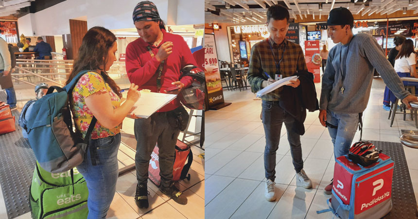 El equipo de la DRTM Poniente se desplegó en un centro comercial capitalino, oportunidad donde se fiscalizó a distintos trabajadores y trabajadoras que efectúan el retiro y traslado de alimentos y/o mercaderías, mediante reconocidas aplicaciones, tales como Pedidos Ya, Cornershop y Rappi, entre otras.
