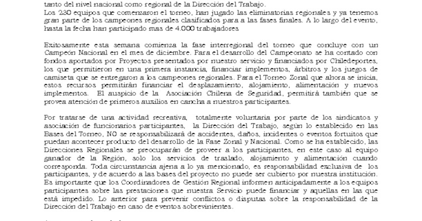 "(...) Por tratarse de una actividad recreativa, totalmente voluntaria por parte de los sindicatos y asociación de funcionarios participantes, la Dirección del Trabajo, según lo establecido en las Bases del Torneo, no se responsabilizará de accidentes, daños, incidentes o eventos fortuitos que puedan acontecer producto del desarrollo de la Fase Zonal y Nacional. Como se ha establecido, las Direcciones Regionales se preocuparán de proveer a los participantes, en este caso al equipo ganador de la Región, sólo de los servicios de traslado, alojamiento y alimentación cuando corresponda. Toda circunstancia ajena a lo ya mencionado, es responsabilidad exclusiva de los participantes y, de acuerdo a las bases del proyecto, no puede ser cubierto por nuestra institución".