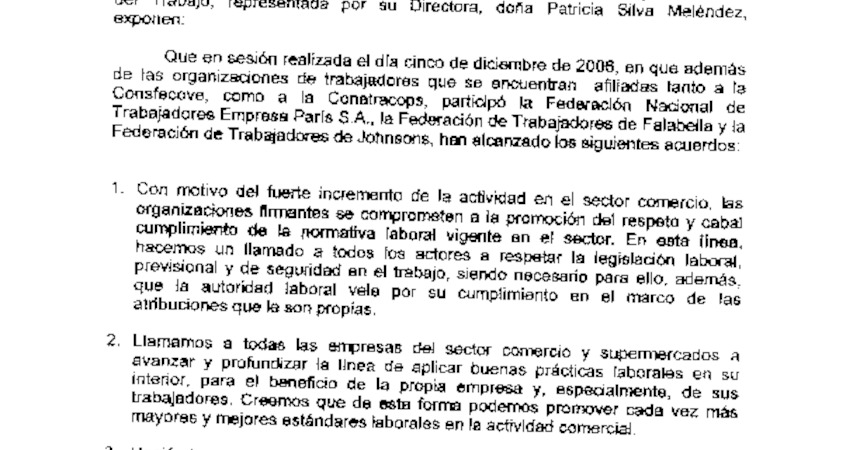 Este compromiso fue suscrito ante la Directora del Trabajo, Patricia Silva Meléndez, por los máximos representantes la Cámara de Comercio de Santiago, la Cámara Nacional de Comercio, Servicio y Turismo y de la Asociación Gremial de Supermercados de Chile (Asach). Los trabajadores estuvieron representados por la Confederación Nacional de Sindicatos y Federaciones de Trabajadores del Comercio, Confección de Vestuario y Actividades Conexas (CONSFECOVE); y la Confederación Nacional del Comercio de la Producción y Servicios (Conatracops).