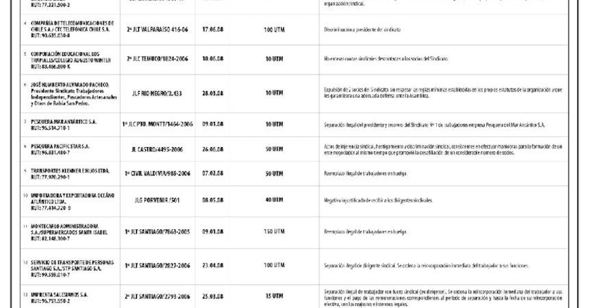 Veinte fueron las empresas condenadas por los Tribunales de Justicia durante el primer semestre de 2008 por haber incurrido en prácticas antisindicales. Su nómina fue publicada por la Dirección del Trabajo en un matutino de circulación nacional, de acuerdo a lo dispuesto en la ley.