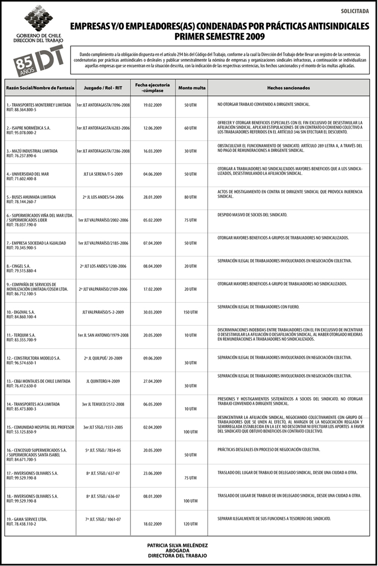 Por haber incurrido en prácticas antisindicales o desleales, diecinueve empresas fueron condenadas por los Tribunales de Justicia durante el primer semestre de 2009. La nómina fue publicada por la Dirección del Trabajo en un matutino de circulación nacional, según lo dispuesto en la ley.