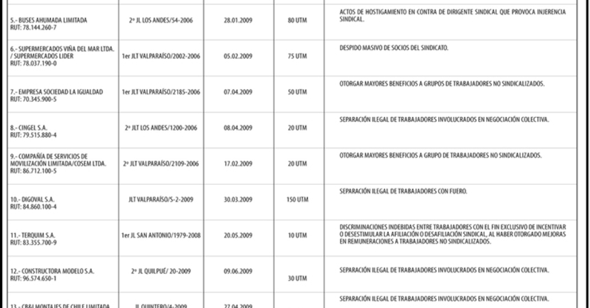 Supermercados Líder, que ya había sido condenado por este tipo de prácticas, en esta oportunidad figura con Supermercado Líder de Viña del Mar Ltda., con una multa de 75 UTM por despido masivo de los socios del sindicato. Anteriormente, Líder figuró en la nómina de infractores del segundo semestre de 2008, con Hipermercado Gran Avenida S.A., y en el primer semestre de 2008, con Hipermercado La Serena Ltda.