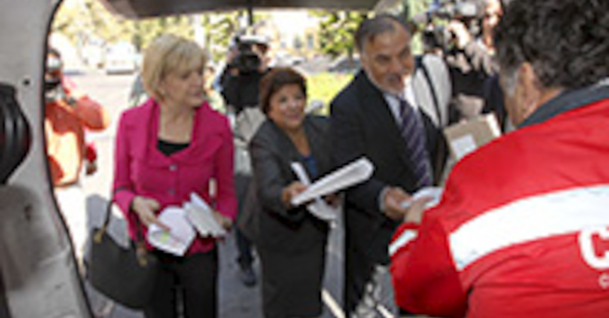 La ministra del Trabajo y Previsión Social, Evelyn Matthei, junto a la directora del Trabajo, María Cecilia Sánchez, y el diputado y ex ministro Osvaldo Andrade, participaron hoy del inicio de una masiva fiscalización a empleadores que han caído en la figura legal de "mora presunta" de cotizaciones previsionales, los cuales a partir de hoy están siendo notificados por carta de esta irregular situación.