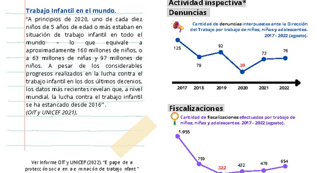 En esta infografía se destacan cifras sobre denuncias, fiscalizaciones y materias sancionadas respecto al trabajo de niños, niñas y adolescentes, para el período 01 de enero de 2017 - 21 de agosto de 2022