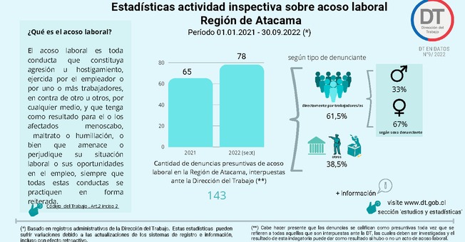 Esta infografía presenta datos de la Región de Atacama sobre denuncias presuntivas de acoso laboral presentadas ante la Dirección del Trabajo en el período 01 de enero de 2021 a septiembre de 2022.