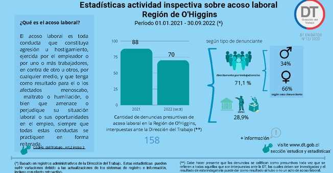 Esta infografía muestra datos de la Región de O'Higgins sobre denuncias presuntivas de acoso laboral presentadas ante la Dirección del Trabajo en el período 01 de enero de 2021 a septiembre de 2022.
