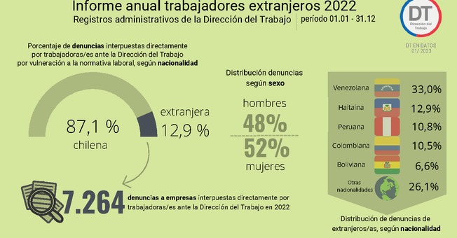 Esta infografía muestra datos destacados de la actividad inspectiva durante el año 2022, respecto a denuncias de extranjeros/as ante la Dirección del Trabajo por vulneraciones a derechos laborales, así como fiscalizaciones a empresas y materias sancionadas.