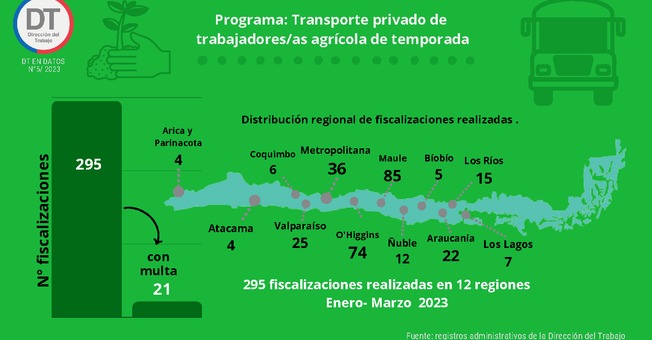 Esta infografía muestra los resultados de los programas inspectivos a empresas del sector agrícola de temporada realizados entre enero y marzo de 2023 en 12 regiones del país, en los ámbitos de: transporte privado de trabajadores/as agrícolas, packing y predios agrícolas.