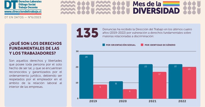 En el marco del mes de la diversidad, esta infografía presenta datos sobre denuncias recibidas por la Dirección del Trabajo en el período 2019-2022 por vulneración a derechos fundamentales, sobre materias relacionadas con actos de discriminación al interior de la empresa por orientación sexual e identidad de género.