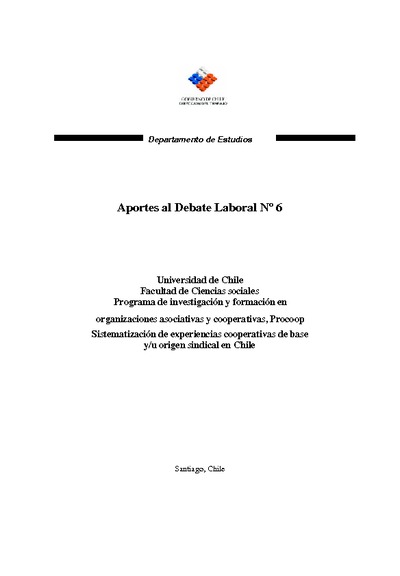 Este documento es el informe final establecido para el mes de diciembre de 1998, correspondiente al Convenio celebrado entre la Dirección del Trabajo y el Programa de Investigación y Formación en Organizaciones asociativas y Cooperativas de la Universidad de Chile - PROCOOP -, el cual consiste en realizar un levantamiento y sistematización de la información existente, que diga relación con las Cooperativas chilenas activas que poseen una base y/o origen sindical o por empresas.