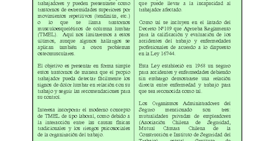 Esta ficha contiene información básica relativa a los trastornos musculoesqueléticolumbares, la cual considera los siguientes temas: protección legal, magnitud del problema, principales factores de riesgo, grupos vulnerables y las principales medidas de prevención que deben considerarse.