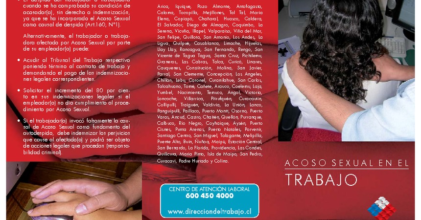 Cartilla que explica quién o quiénes pueden cometer acoso sexual en el trabajo; cuáles son las eventuales víctimas; qué hacer ante una situación de este tipo; cuáles son las sanciones que contemplan el Reglamento Interno de la empresa y la ley en estos casos, y el rol de las Inspecciones del Trabajo en la materia.